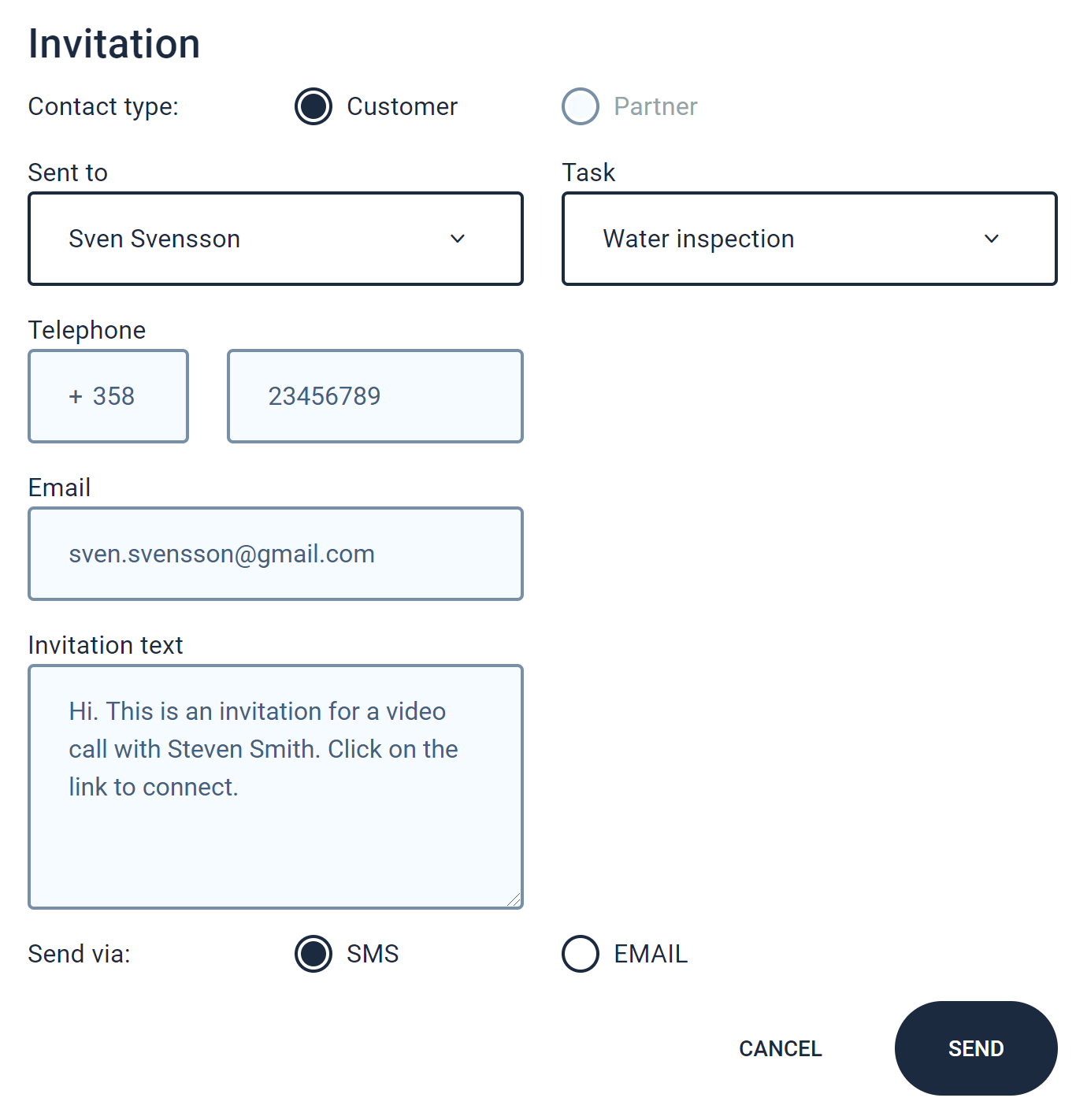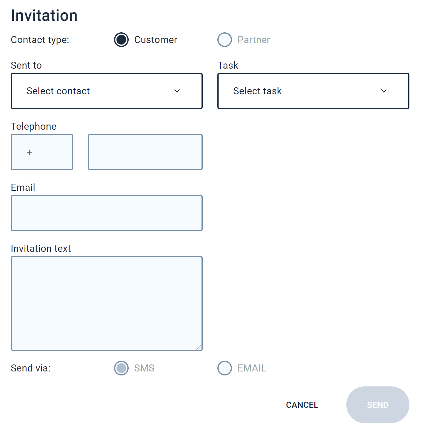 It is possibility to select if the invite should be sent via email or SMS, depending on the details of the selected contact. If only phone number is available, it will only be possible to select SMS and vice versa.