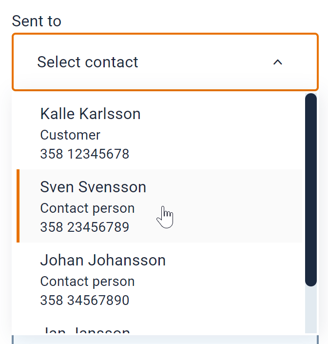 When selecting the receiver of the invite, all contact persons listed in the case information are available in the drop-down menu. Mark the wanted contact and the details will be shown in the invite view.