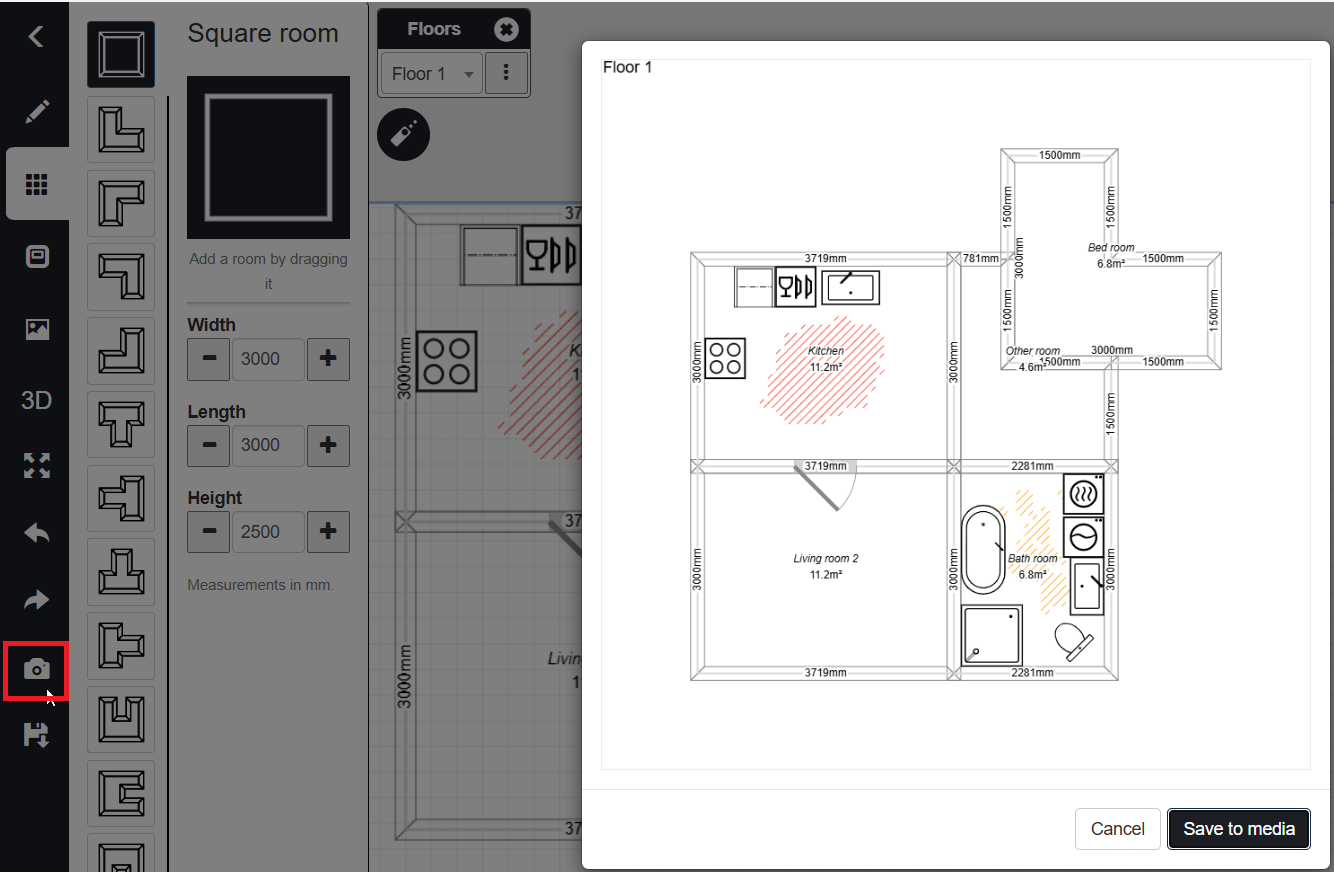 Previously it has been possible to take snapshots only of the wall- and 3D view of the FloorPlanner drawing tool, but now it is possible in the 2D view also. This is done by pressing the camera icon in the menu, which has now been moved to the left side of the screen.