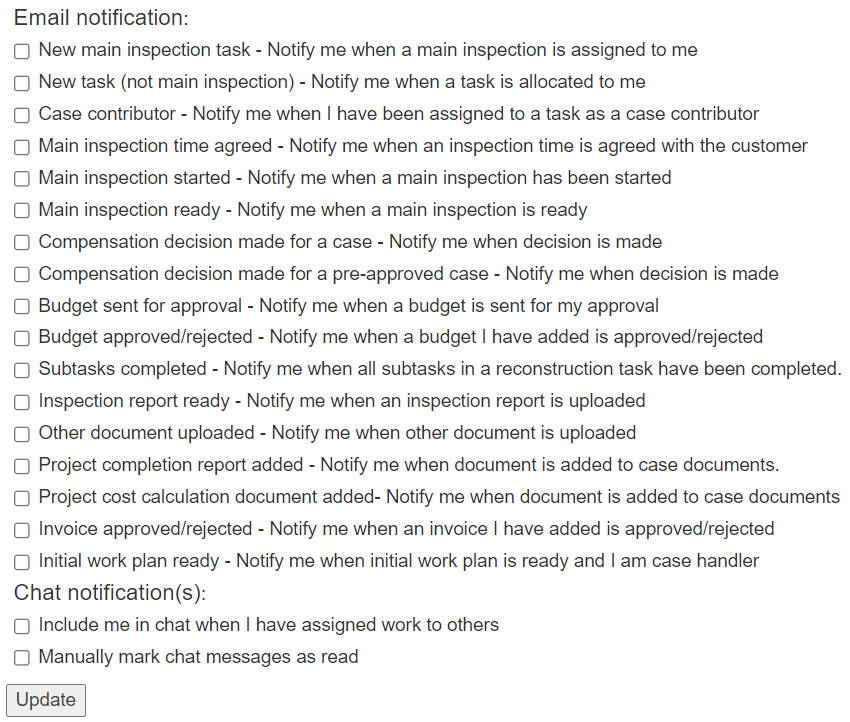 When you have clicked on Notifications, you will see all the different kinds of notifications you can decide on a personal level whether you wish to receive or not. You will find different notification settings for email notifications and for chat notifications. Each setting has a checkbox next to it, if a checkbox has been marked, you will receive a notification when the triggers for this notification have been met. If you for example have marked that you wish to receive a notification whenever you receive a new task (i.e. your user has been set as responsible for the task), then a notification will be sent to your email address when you are assigned a new task. If there are things you do not wish to receive notifications for, you just leave the boxes for these occurrences unmarked.