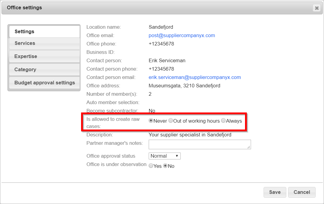 The options here are Never, Out of working hours and Always. Never will be selected for all offices by default, meaning that no offices are able to create raw cases automatically. When an office has been given permission to create raw cases, members from this office are able to create raw cases, either outside of the working hours defined in the portal, or always. Remember to click Save when you have made changes.