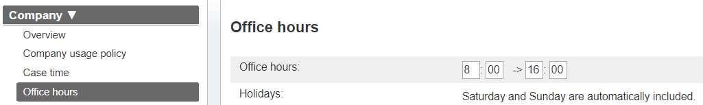 As previously mentioned, it is possible to give an office access to create raw cases only outside of the working hours defined in the portal. The office hours are defined under Company admin -> Company -> Office hours. In the example below, the office hours are set from 08:00 to 16:00. This means that on weekdays from 8:00 to 16:00, offices which have been given permission to create raw cases outside of working hours won’t have access to create raw cases, whereas before 8:00 or after 16:00, as well as during weekends and holidays, they are able to create raw cases.