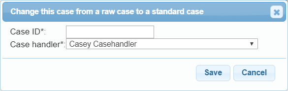 If To normal is pressed, the user will have to input a Case ID for the case, as well as select a case handler for the case. When this is done, and the user has clicked Save, the case is converted into a normal case, meaning that the case is similar to other cases created by the insurance company.