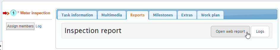 If you want to fill out or look at a previously filled report from the web portal, open the relevant task by clicking on the task on the left side of the screen (when you open a case the main inspection will be open by default), then click on the “Reports” tab. Under this tab you can see the report log (by clicking ‘Logs’), which shows all changes in the report, and “Open web report”. When you click “Open web report”, the report will open, showing previously filled information if there is any, or as a blank report if not yet filled out. The report follows the same template as on a tablet.