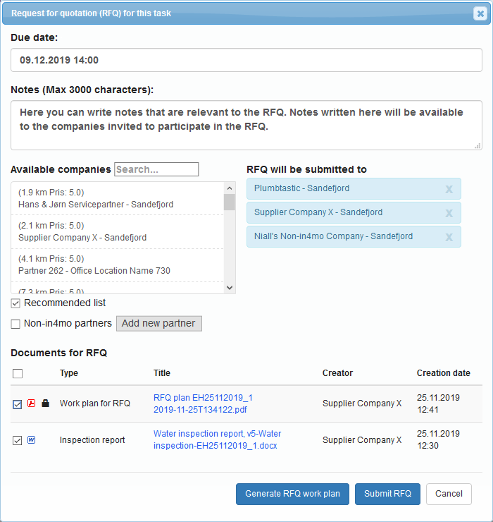 At the bottom you can select what documents should be added to the RFQ under Documents for RFQ. Documents added here will be available to the companies invited to the RFQ. The list shows the documents available in the document library in the case. If iCC is in use in the portal, it is also possible to create a work plan for the RFQ directly from this window by clicking the Generate RFQ work plan.