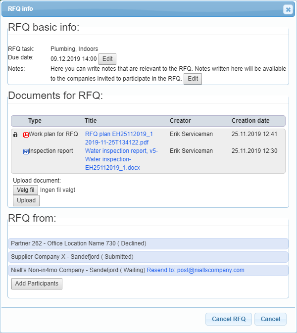 While an RFQ is still ongoing, it is possible to change the due date for submitting a quotation (e.g., prolong the deadline to get more quotations), to edit the notes field, to add documents, to resend the RFQ invitation to participants who have not yet submitted an offer or declined to do so, and it is also possible to add more participants to the RFQ.