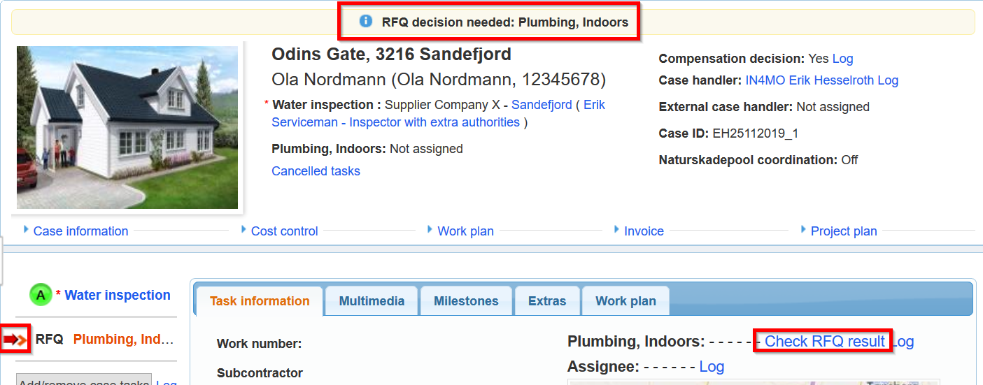 Users who can decide on the outcome of the RFQ will see a red arrow in the case list for the case. When opening the case, there will be red arrow next to the task(s) for which a decision must be made. There is also a yellow box above the case information telling what kind of action is required in the case.