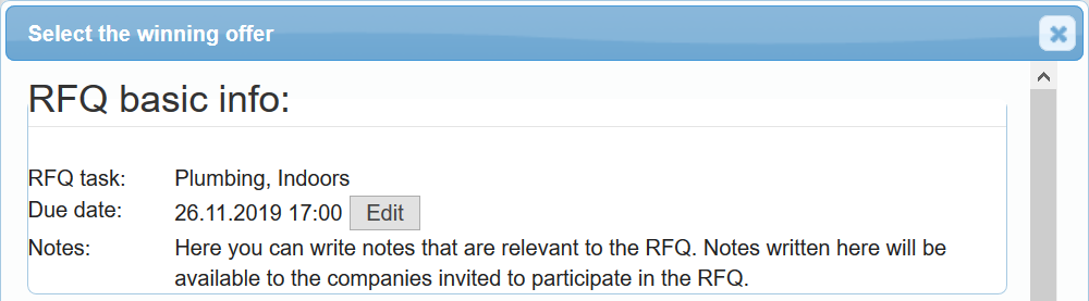 You select the Due date for the RFQ, meaning the deadline for the invited companies to send their quotes. The Notes field can be used for writing down any information relevant to the RFQ. These notes will be available to the invited companies.