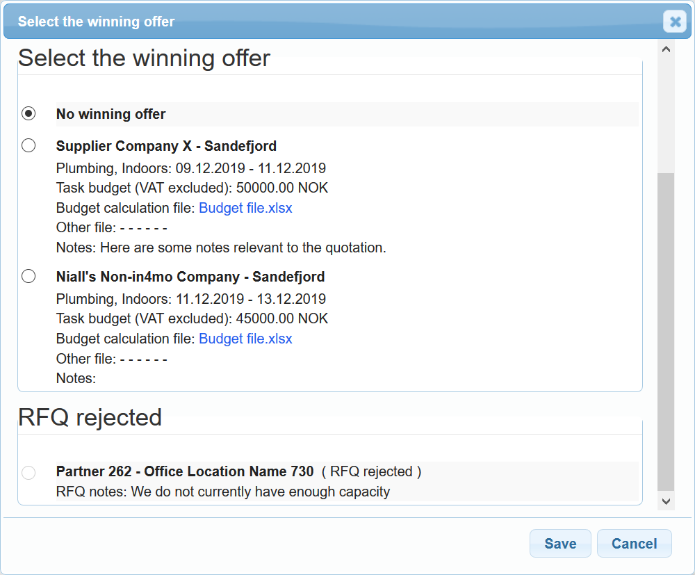 To select a winning offer, mark the winning offer and click Save at the bottom right. If you select No winning offer, the task will go back to status C. If you select a winning offer, the selected partner will be assigned to the task, and the budget will automatically be added to the Cost control tab of the case. If the winner is from the partner network in the portal, the selected responsible person will also automatically be assigned to the task.