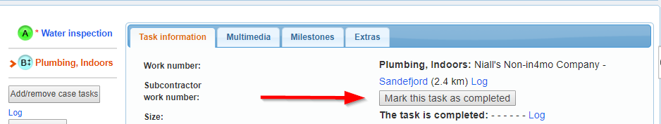 When an insurance company member opens the task assigned to a non-in4mo partner, they will see a button called Mark this task as completed under Task information. By clicking this button, the task will move from status B++ to 4 and can then be approved or rejected as completed in the same way as any other task. If the insurance company receives pictures from the partner, about the progress of the work, the insurance company can add these to the task’s Multimedia.