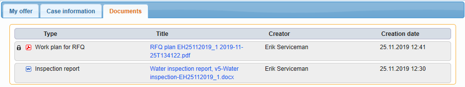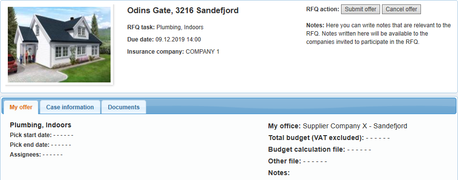 When an RFQ is initiated, the invited parties will receive an email which grants access to the RFQ through a link. When clicking this link, the RFQ page will open in a browser. Here you have access to see information about the case, as well as to submit an offer or decide to not submit an offer. You will find three tabs on the page: My offer, Case information and Documents.