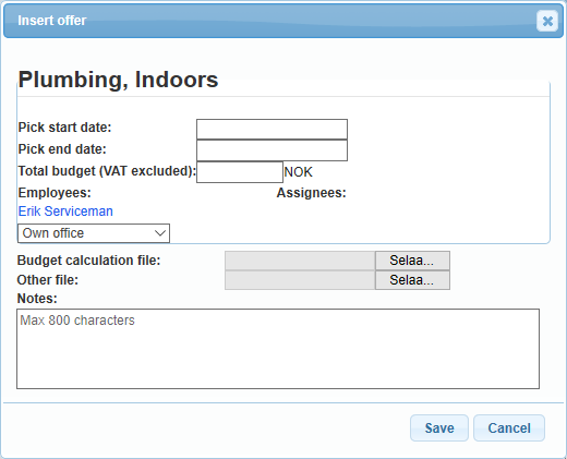 When you click Submit offer, a new window will pop up. It is from this window you make your offer. Pick a start and end date for the task, the total sum of your quotation (excluding VAT), select who will be set as the responsible person for the task, then attach a budget file. You may also attach another file if you have more documents relevant to the offer. At the bottom you can add notes to your quotation, which will be available to the person choosing the winning offer. When you are ready, click Save. Your offer has now been submitted and can be seen from the RFQ page under My offer for as long as the RFQ is open. It is also possible to make changes to your offer until the due date for the RFQ.