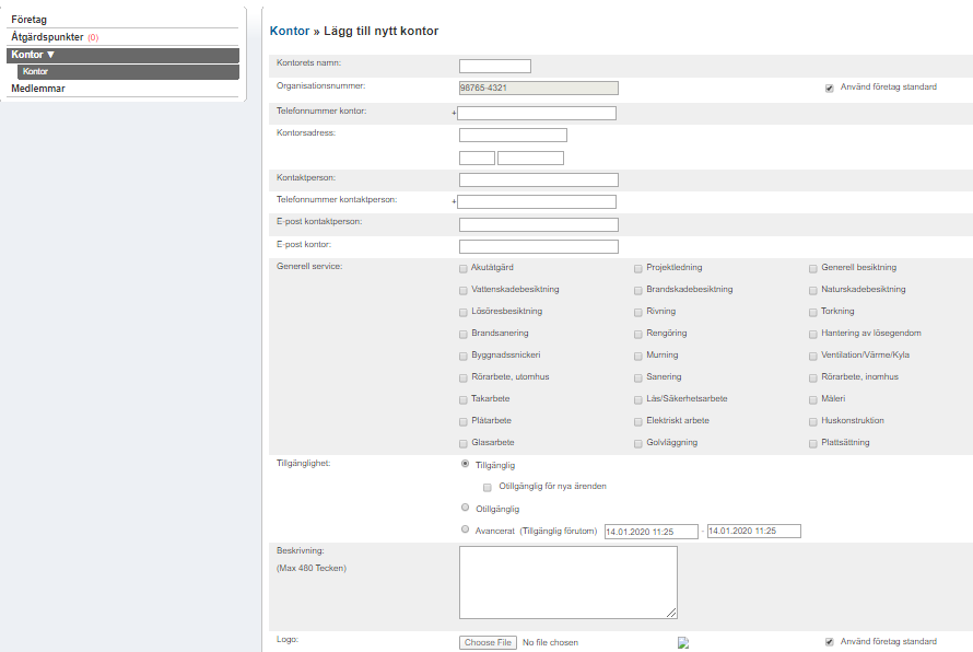 För att lägga till ett nytt kontor, klicka på +Lägg till nytt kontor i högra hörnet på sidan. Fyll i den information som behövs för det nya kontoret. Den generella servicen och expertisen som kontoret erbjuder, bör väljas noggrant för det aktuella försäkringsbolaget.