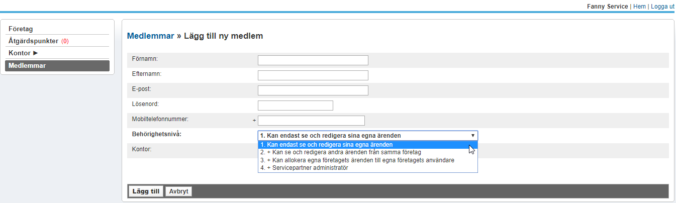 Rollen som företagets admin innebär att du har den högsta behörighetsnivån (4). Du kan ändra och lägga till medlemmar och kontor i ert företag.