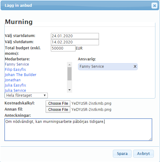 När kostnadsberäkningen är gjord och budgeten fastställd, tryck på Spara för att skicka erbjudandet. Bifoga budgeten för uppgiften och kostnadsberäkningen.